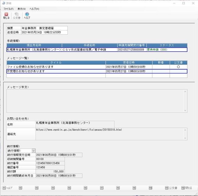 「詳細」画面で、メッセージ一覧の公文書欄に「〇」のついているメッセージを選択し、ツールバーの「公文書」ボタンをクリックするか、メニューの「ファイル」-「公文書の取得」を選択します。