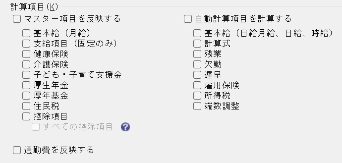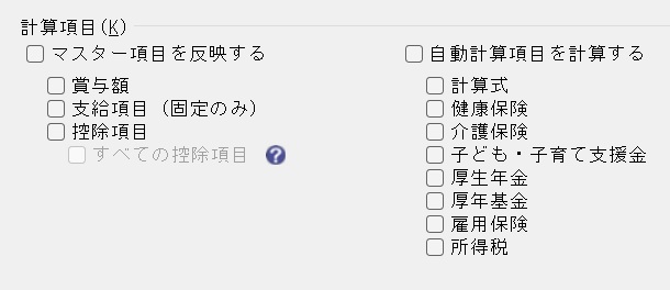 計算対象の選択により、計算項目が異なります。 計算項目にチェックマークを付けます。 「マスター項目を反映する」「自動計算項目を計算する」を選択すると、詳細項目すべてにチェックマークが付きます。 〇給与選択時