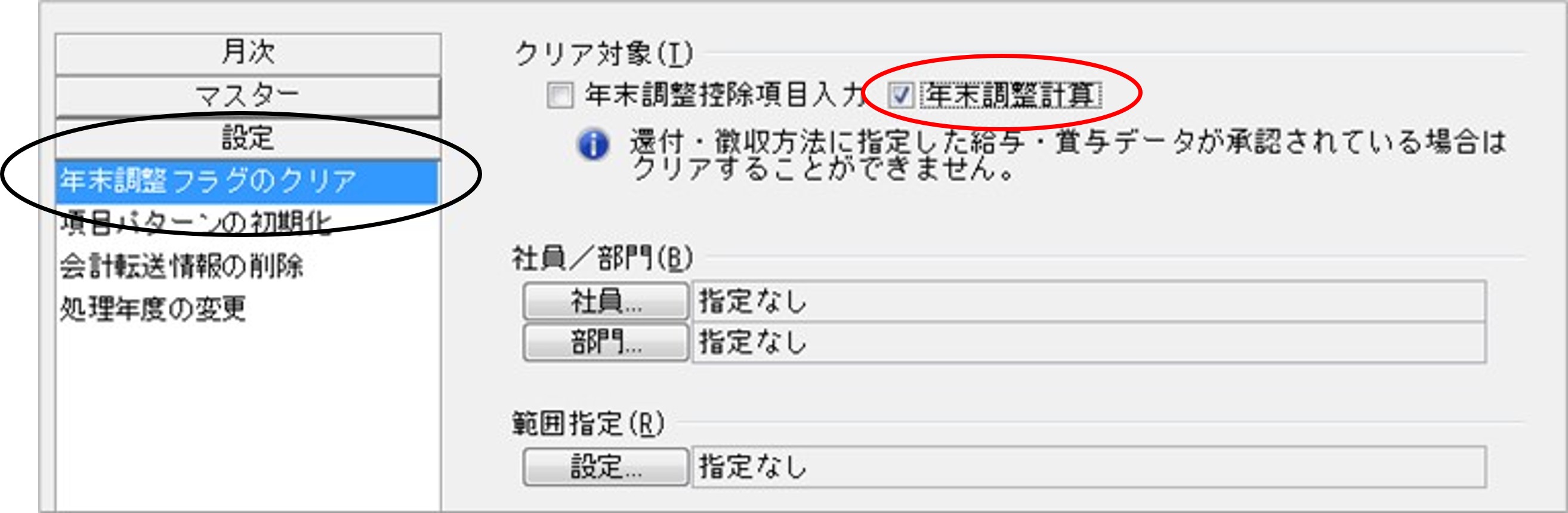 (1) 「還付・徴収方法」変更前に、メニューの「ファイル」-「データの保守」の「設定」-「年末調整フラグのクリア」を選択し、クリア対象を「年末調整計算」にして実行してください。年末調整計算前の状態に戻します。