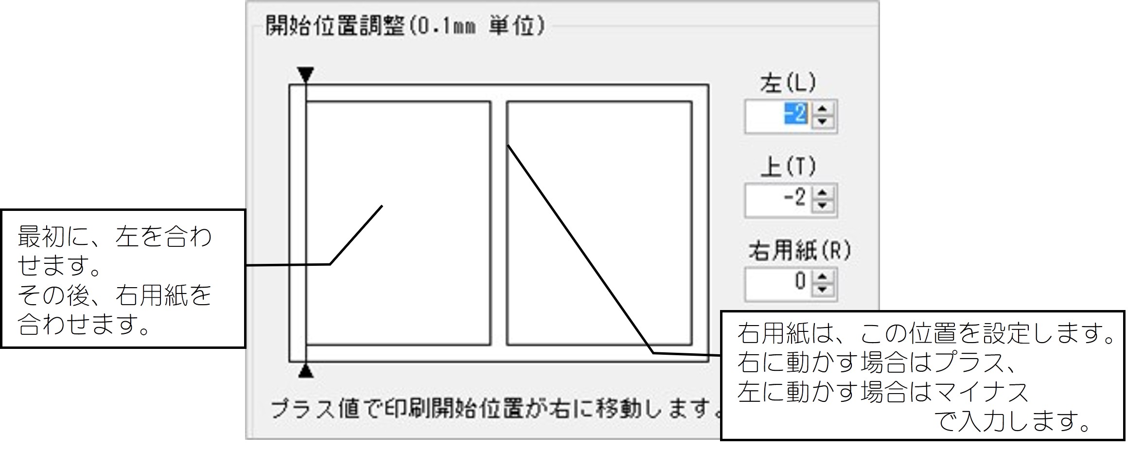開始印字位置調整:左、上、右用紙の位置を0.1㎜単位で設定できます。