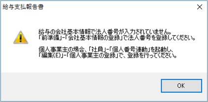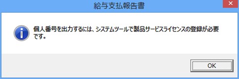 また、個人番号を出力する帳票では、個人番号を出力できない場合、メッセージが表示されます。内容をご確認の上、設定を行ってください。次の「Q16.個人番号が出力されません。どうすればよいのでしょうか?」もご覧ください。