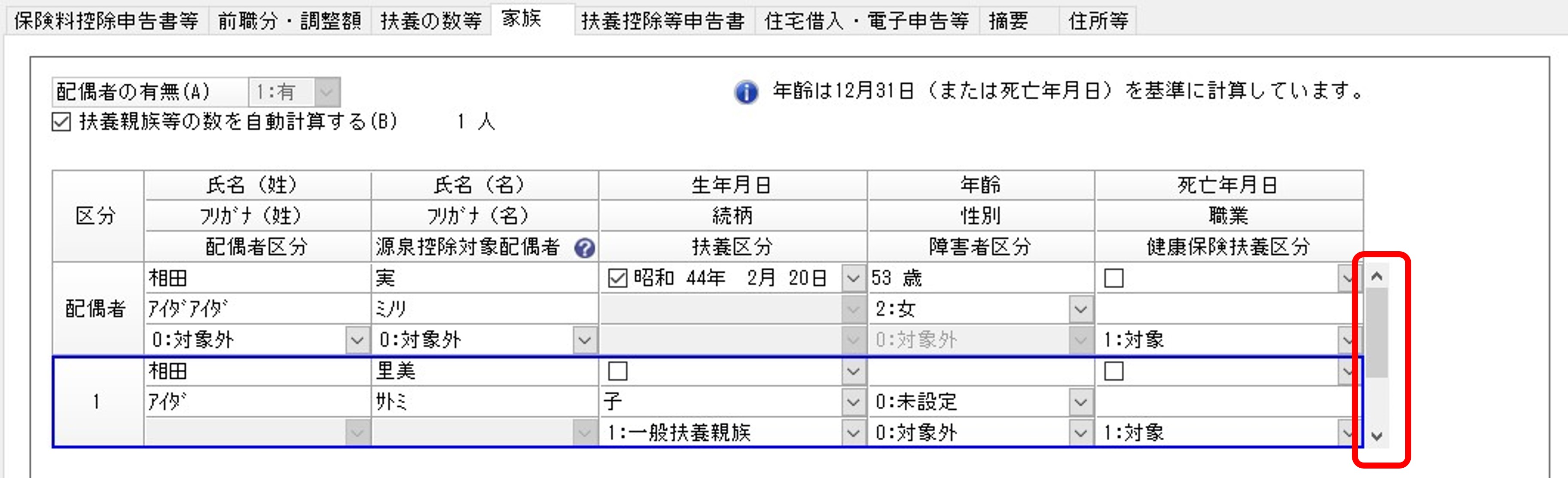 A26.「年末調整」-「年末調整控除項目入力」を起動し、[家族]タブの[源泉控除対象配偶者]に表示される「?」マークをクリックすると、操作ナビが表示されますので参考にしてください。
