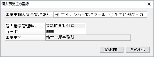 A43.個人事業主の場合、法定調書合計表などの「個人番号又は法人番号欄」に 個人番号を印刷する際に「マイナンバー管理ツール」と連動して出力するか、都度入力して出力するかを選択できます。
