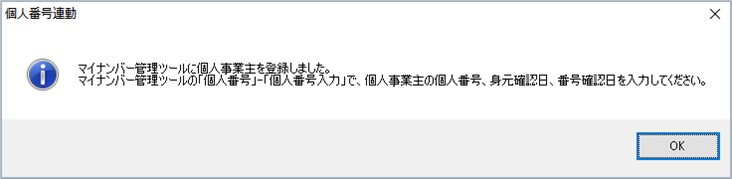→「マイナンバー管理ツール」の「個人番号」-「個人番号入力」で個人事業主の個人番号、身元確認日、番号確認日を入力します。