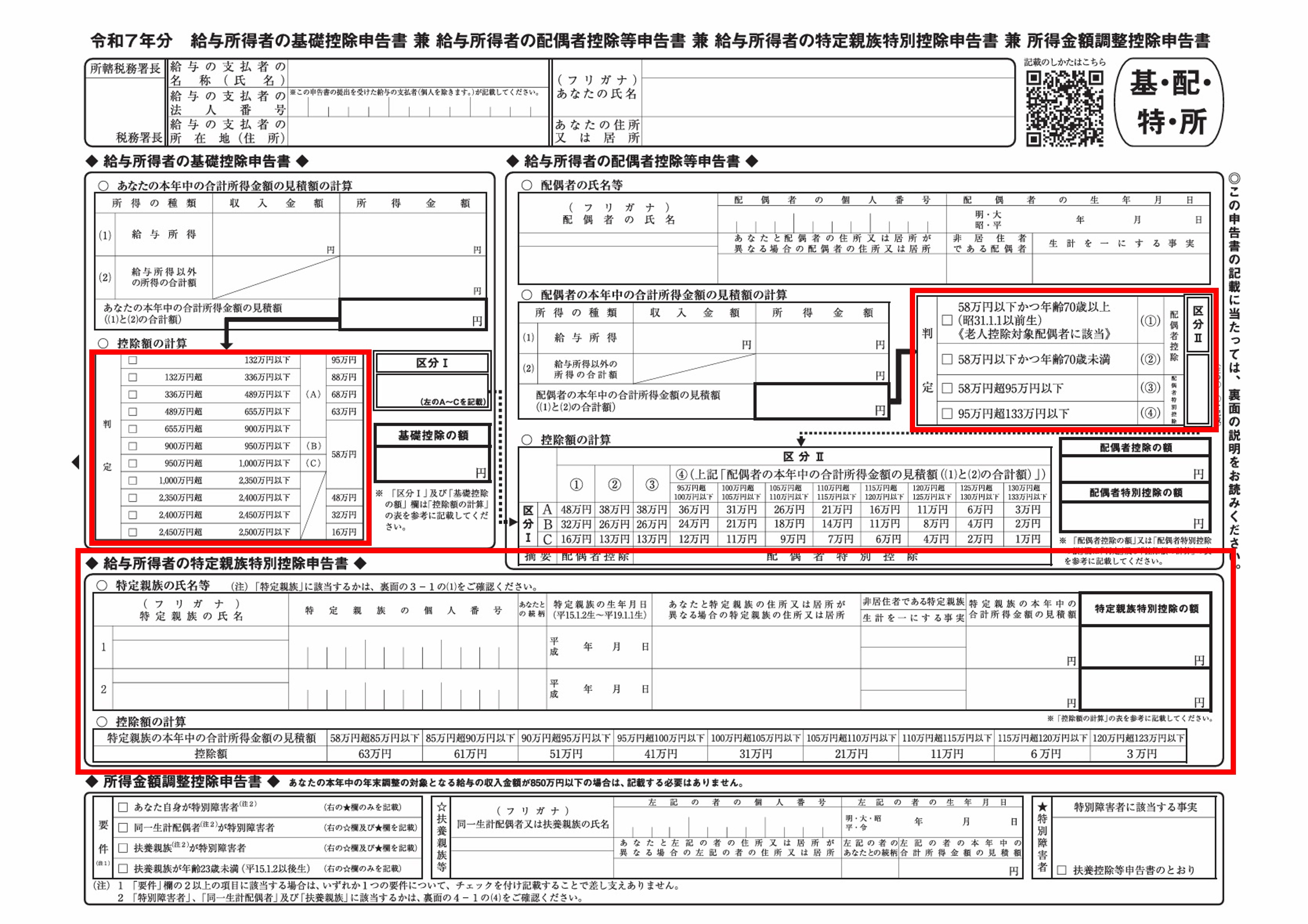 令和7年分 給与所得者の基礎控除申告書 兼 給与所得者の配偶者控除等申告書 兼 給与所得者の特定親族特別控除申告書 兼 所得金額調整控除申告書