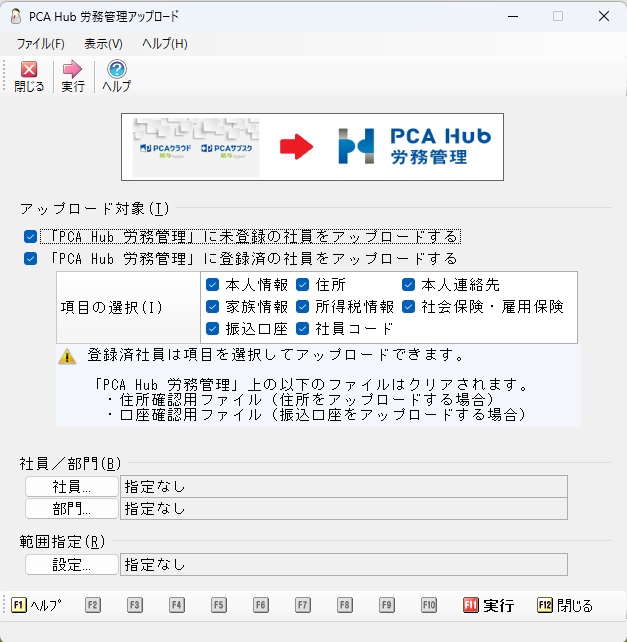 メニューの「社員」-「労務管理連動」-「PCA Hub 労務管理アップロード」を選択すると、以下のような画面が表示されます。