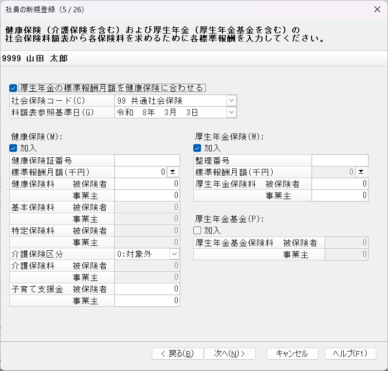 厚生年金の標準報酬月額を健康保険に合わせる場合、チェックマークを付けると、厚生年金の各項目欄は自動表示になります。 |