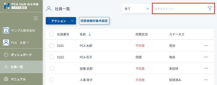 (2) 「社員一覧」ページにて「同意状況」列の内容を確認します。