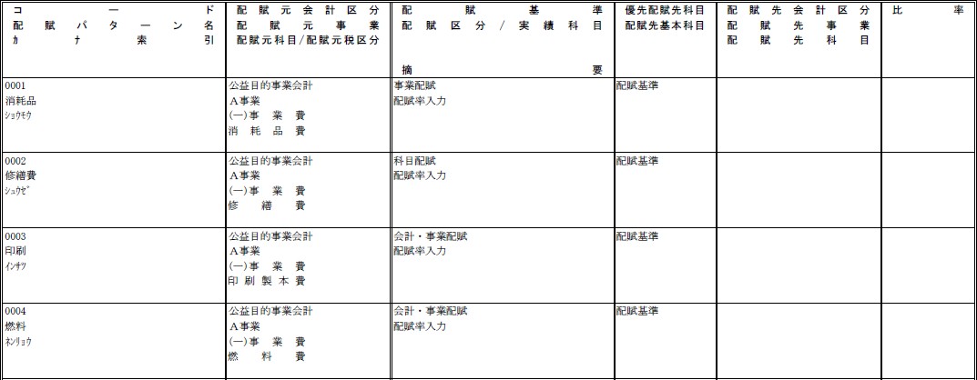(3)「配賦パターンの登録」で科目配賦情報を以下のように設定します。