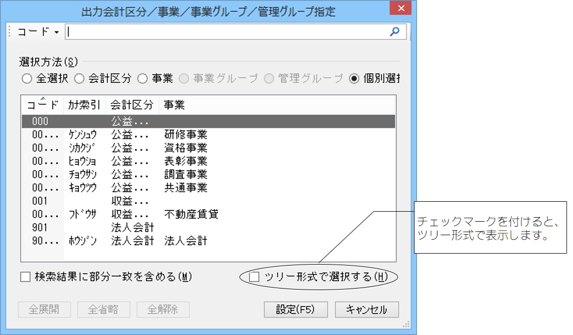 出力する 会計区分/事業/事業グループ/管理グループを選択します。