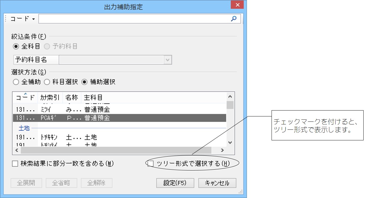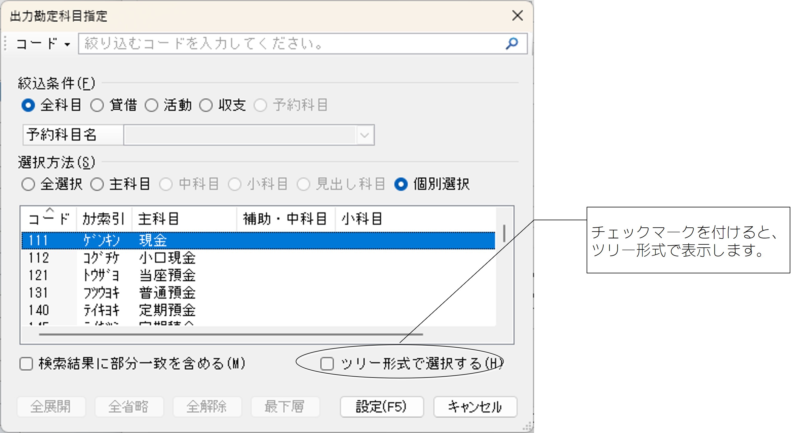 • 主・補助・中・小・見出し科目:それぞれ主・補助・中・小・見出し科目のみ、絞り込んで表示します。