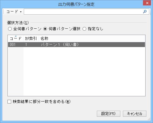 ボタンをクリックすると、「出力伺書パターン指定」画面が表示されますので、「選択方法」を以下から選択します。伺書パターンを選択後、[設定]ボタンをクリックします。