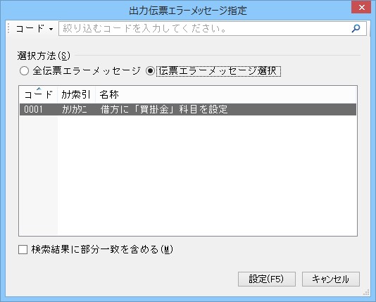 ボタンをクリックすると、「出力伝票エラーメッセージ指定」画面が表示されますので、「選択方法」を以下から選択します。伝票エラーメッセージを選択後、[設定]ボタンをクリックします。