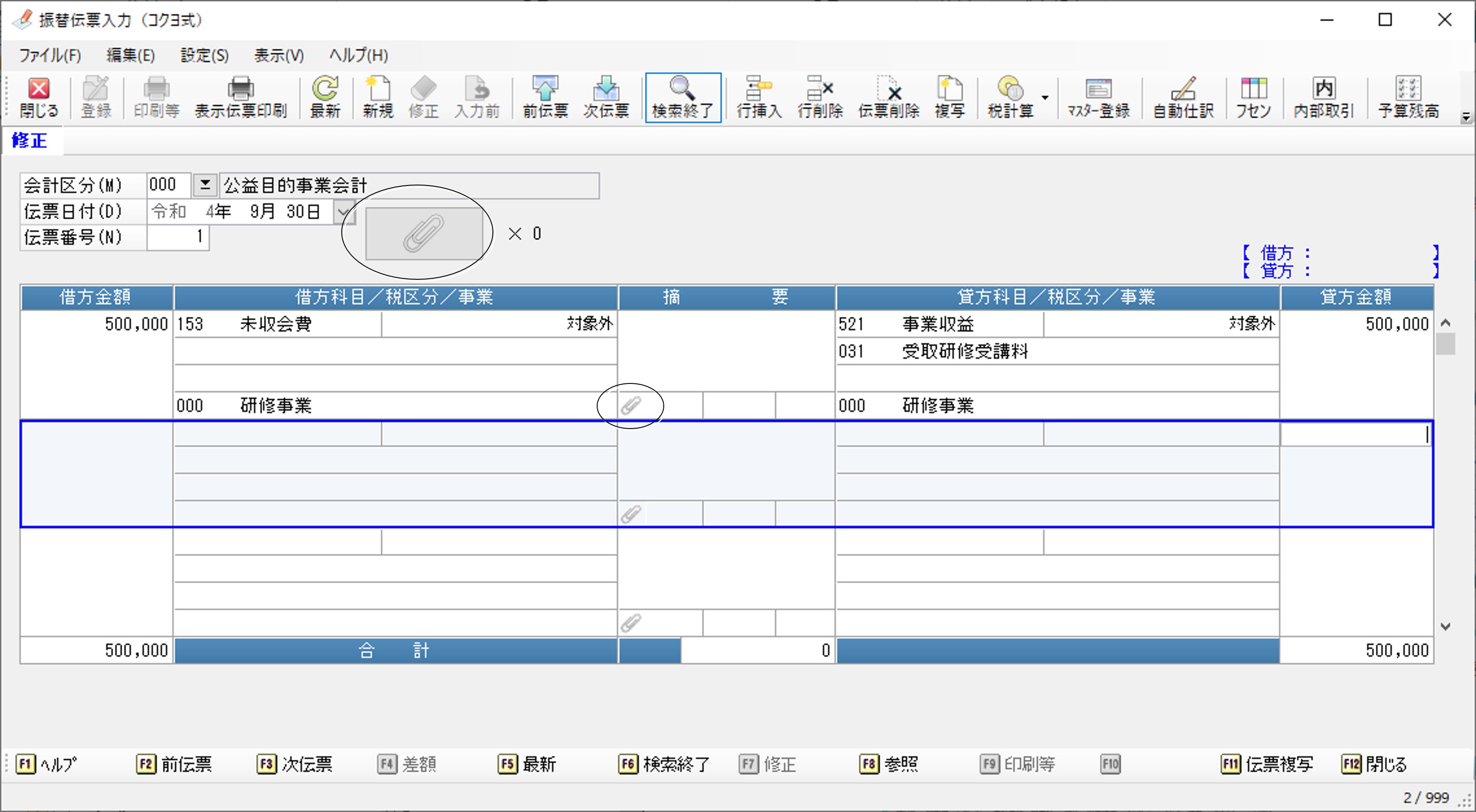 ドキュメントファイルが関連付けられていない仕訳は、クリップだけが表示されています。