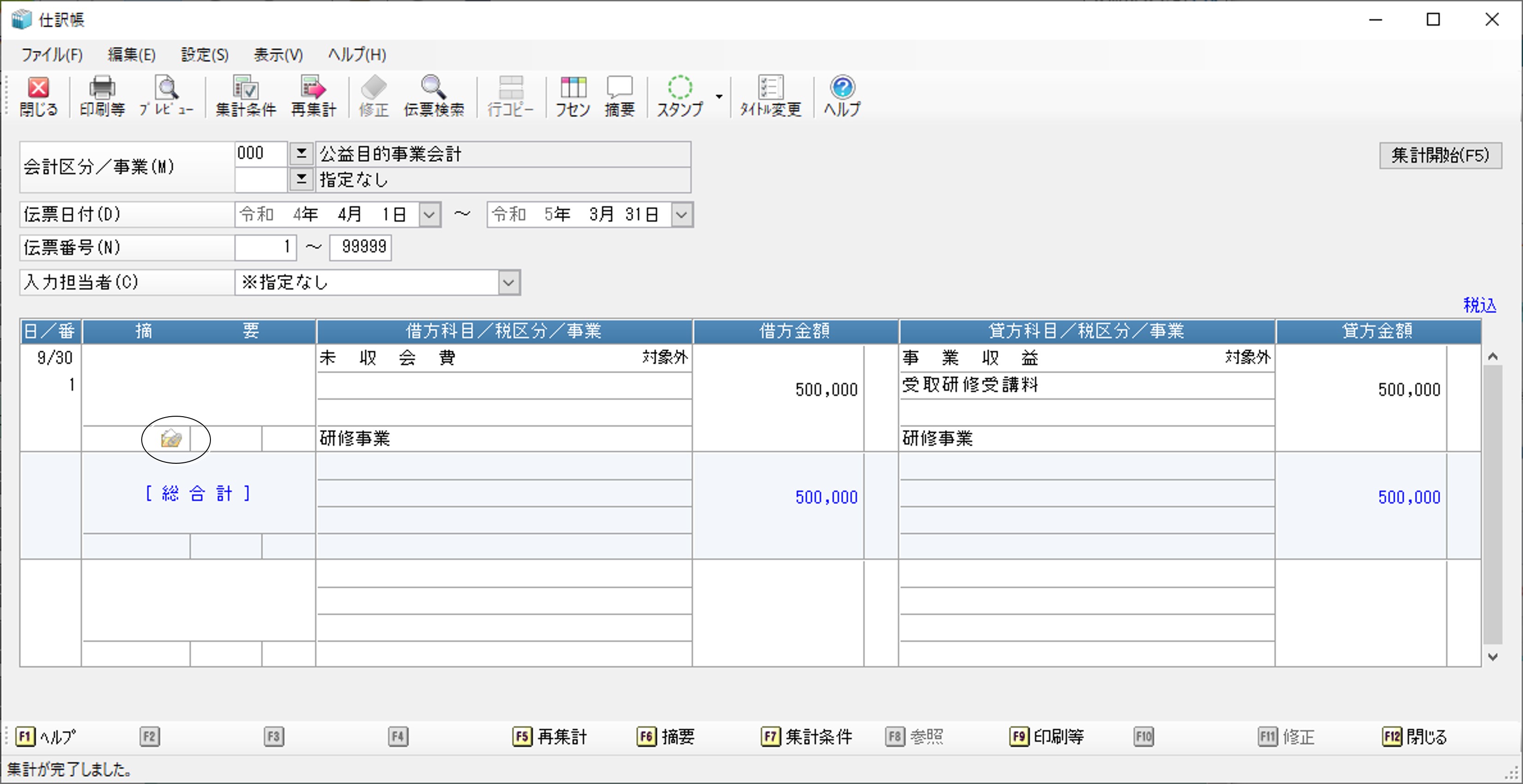 ドキュメントファイルが関連付けられている仕訳は、ドキュメントが挟まっていてクリップが付いたファイルが表示されています。
