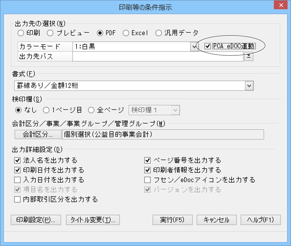(1) 「印刷等の条件指示」画面等の「出力先の選択」で「PDF」を選択し、「PCA eDOC連動」にチェックマークを付けて出力を実行します。