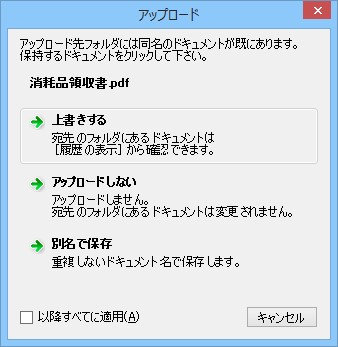 (2) アップロード先フォルダに同名のドキュメントが既に存在する場合は、「アップロード」画面が表示されますので、動作を以下から選択してください。