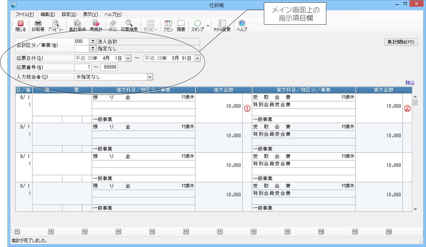 (1)  「条件指示」「印刷等の条件指示」画面で集計範囲等を指定します。指示できる項目は処理によって異なります。項目の説明は、「共通操作」-「条件指示項目のまとめ」をご覧ください。