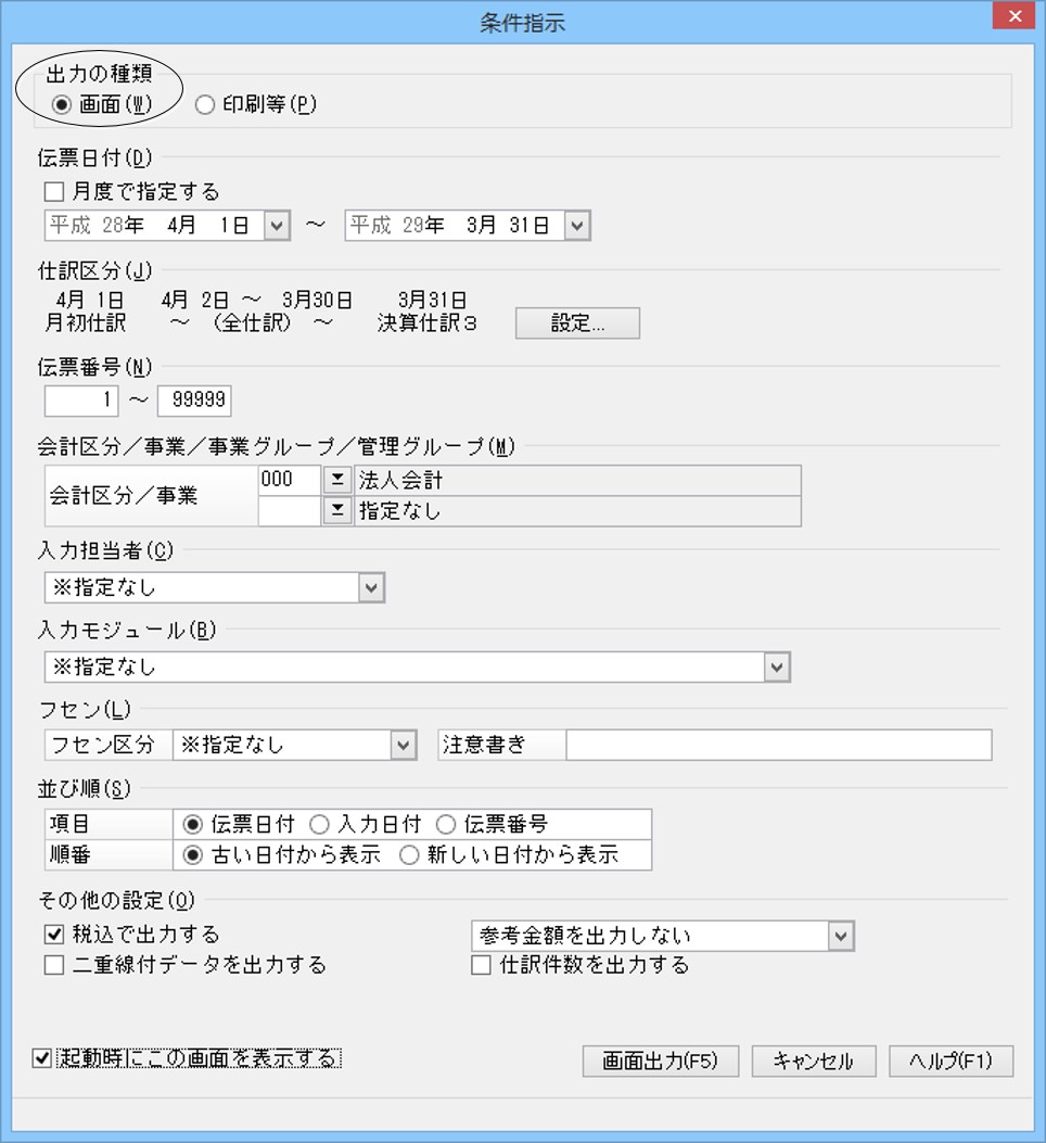 • 「条件指示」画面の「起動時にこの画面を表示する」にチェックマークを付けると、処理の起動時に「条件指示」画面が表示されるようになります。