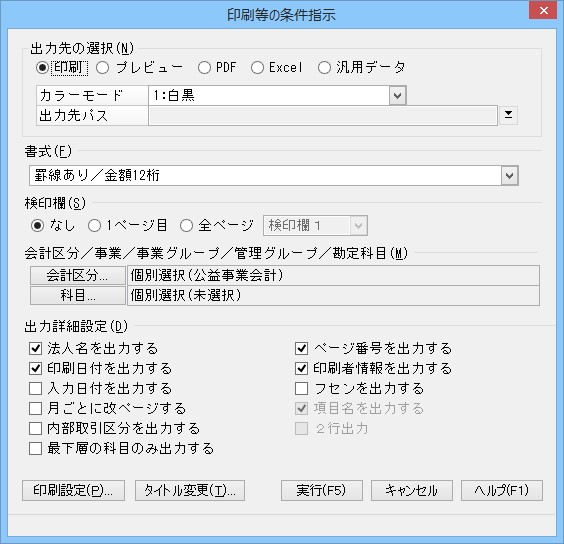 条件指示後、「出力先の選択」で「印刷」「プレビュー」等を選択し、[実行]ボタンをクリックします。