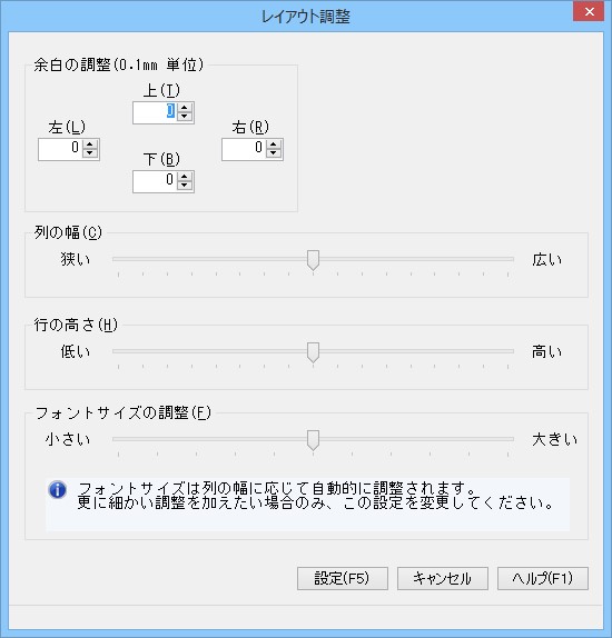 「狭い」「広い」の間にあるバーを動かして指定します。「狭い」の方に動かすとフォントサイズが大きくなり、「広い」の方に動かすとフォントサイズが小さくなります。印字する行数が増減しますので、必要に応じて調整してください。