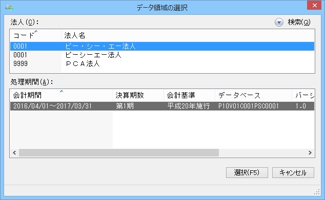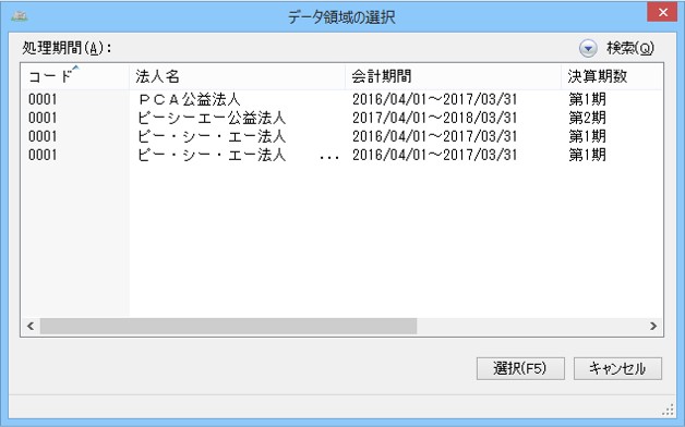 「設定」-「メニュープロパティ」-「その他」の「データ領域の選択時に法人別リストを表示する」のチェックマークを外すと、法人と処理期間をまとめて一覧で表示することができます。