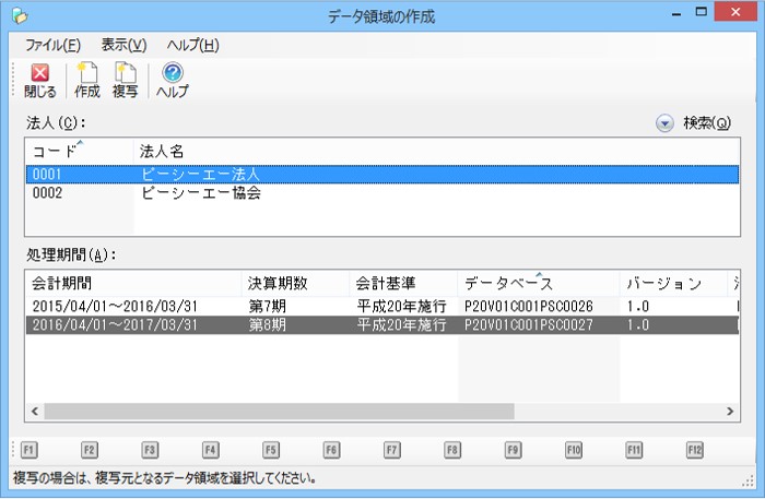 既存のデータ領域を複写することもできます。登録済みのデータ等は複写先にコピーされます。