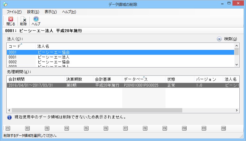 現在使用中のデータ領域は削除できません。処理画面にも表示されません。