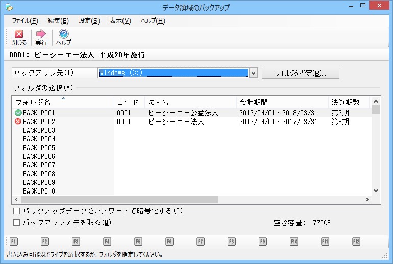 メニューの「ファイル」-「データ領域のバックアップ」を選択すると、以下のような画面が表示されます。