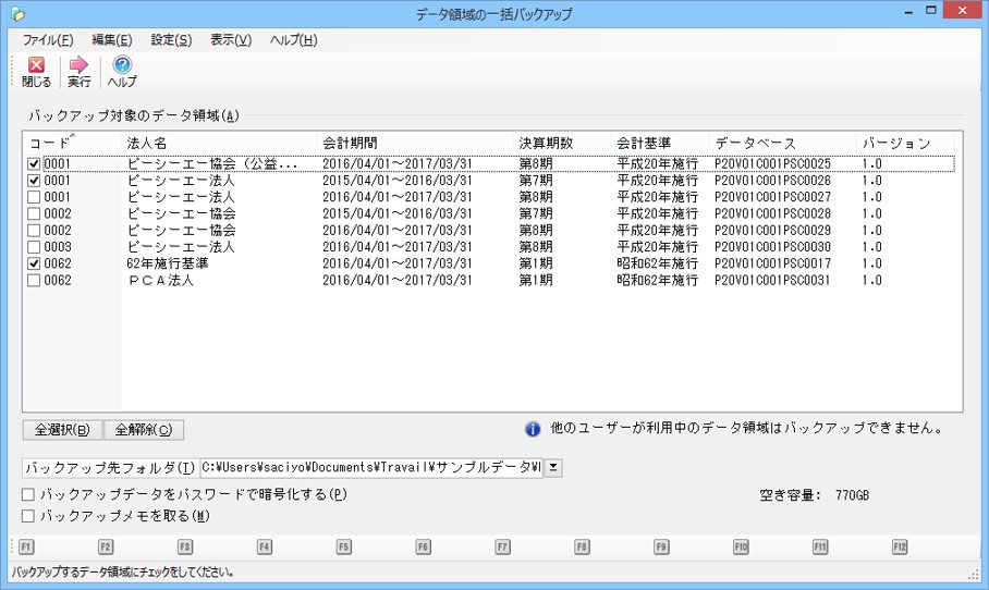 メニューの「ファイル」-「データ領域の一括バックアップ」を選択すると、以下のような画面が表