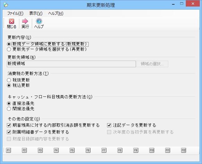 期末日が過ぎ、新年度のデータを入力する前に実行します。期末更新を実行すると、現在使用中のデータ領域を元に、新年度用のデータ領域が作成されます(データ領域は1法人1年分を1領域として管理しています)。新年度のデータを入力する場合は、「データ領域の作成」ではなく、本処理を実行します。