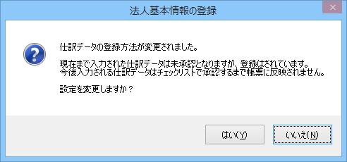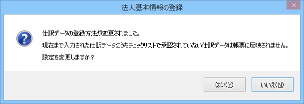 仕訳・予算データが入力されている場合は、変更するメッセージが表示されます。設定を変更する場合は、[はい]をクリックします。