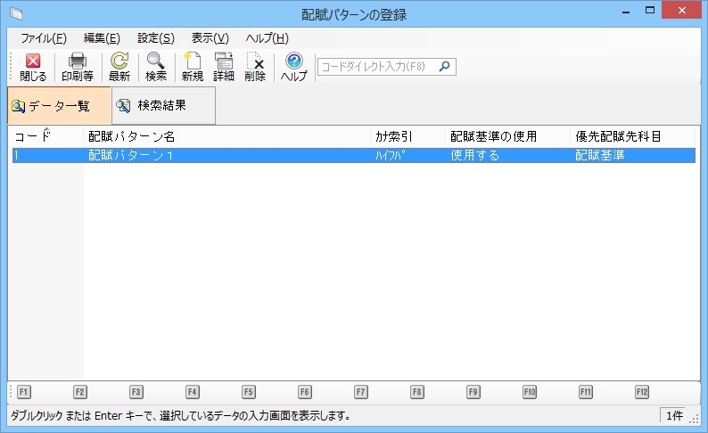 メニューの「前準備」-「配賦パターンの登録」を選択すると、以下のような画面が表示されます。