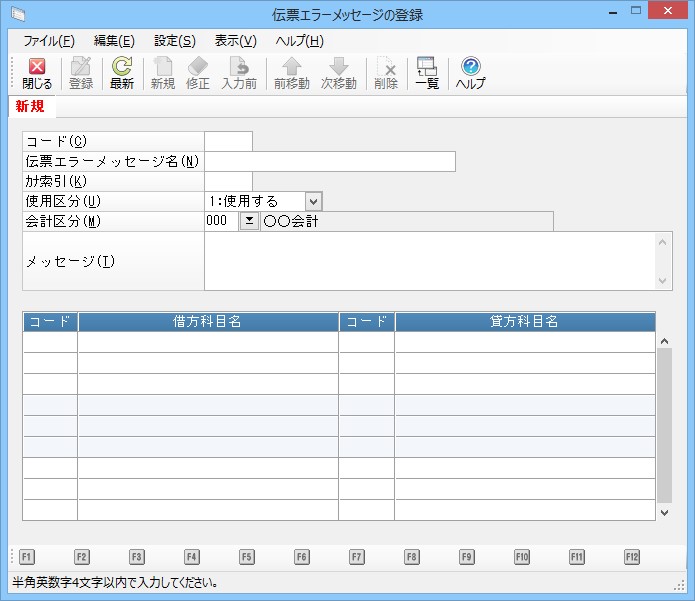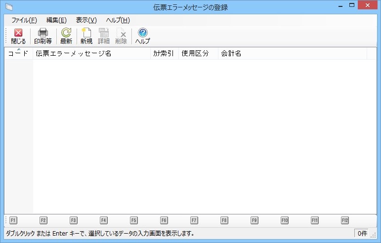 メニューの「前準備」-「伝票エラーメッセージの登録」を選択すると、以下のような画面が表示されます。