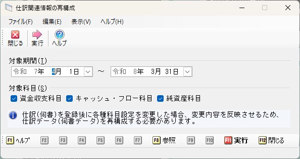 メニューの「前準備」-「科目の登録」-「仕訳関連情報の再構成」を選択すると、以下のような画面が表示されます。
