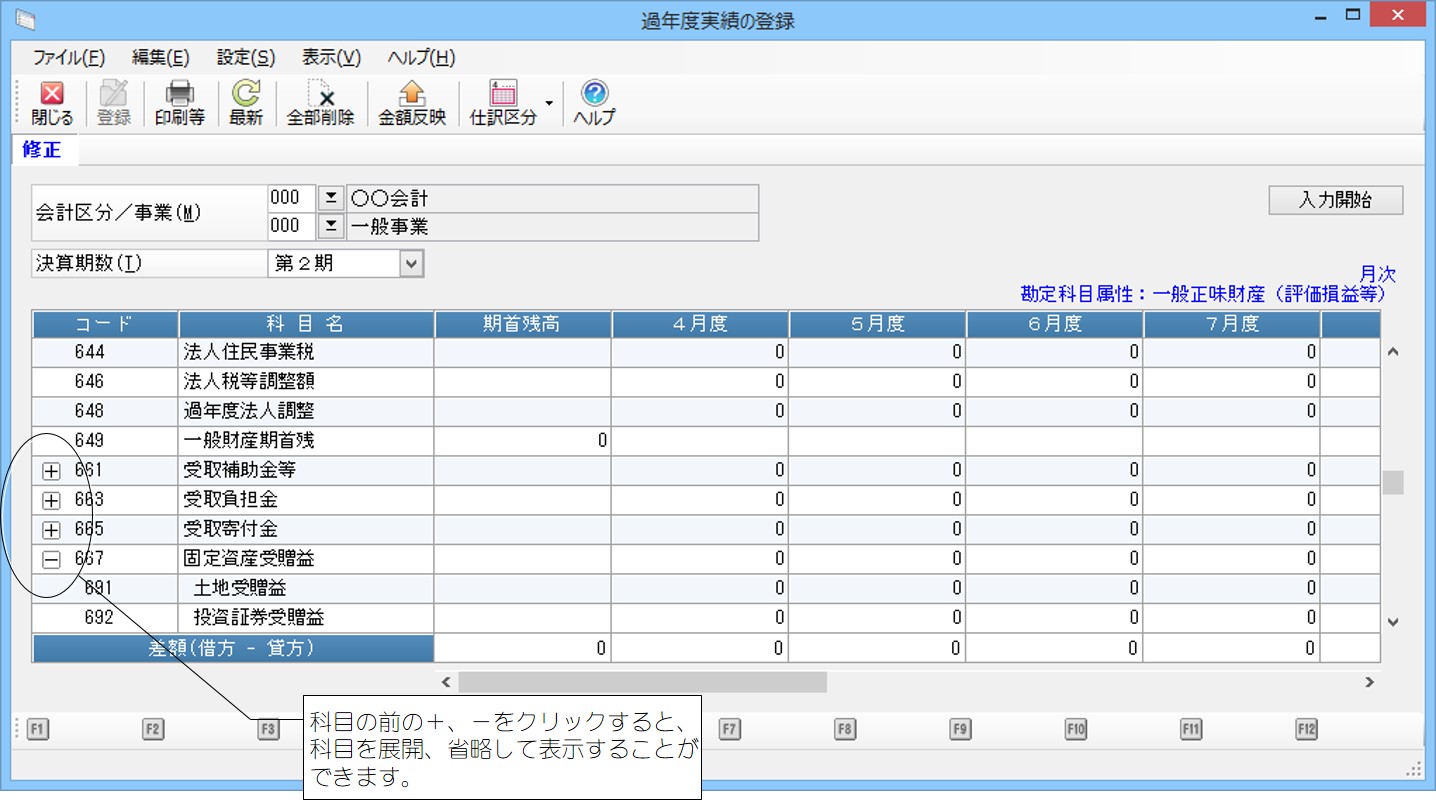 科目体系にしたがって、主科目、補助科目、中・小科目の前年度実績を登録・修正します。