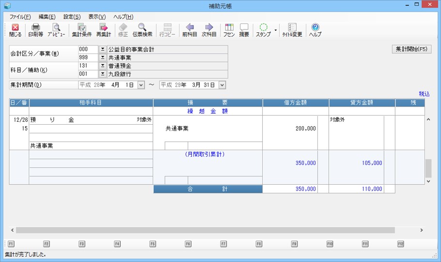 以下は、「日常帳票」-「補助元帳」で、勘定科目“普通預金”に登録されている補助科目“九段銀行”に関する明細を表示している画面です。
