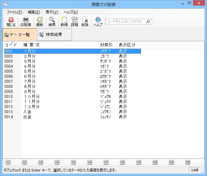 1. 摘要マスター(メニューの「前準備」-「摘要文の登録」)