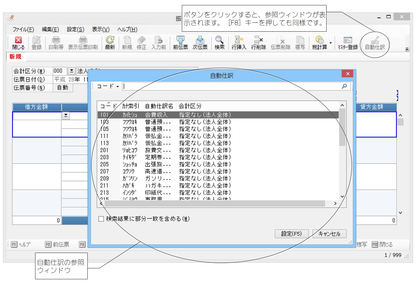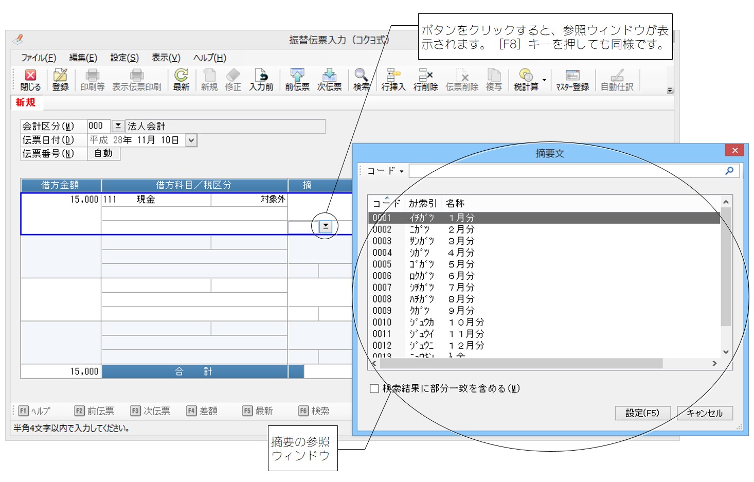 以下のように、データ入力の際に参照ウィンドウから摘要を入力することができます。