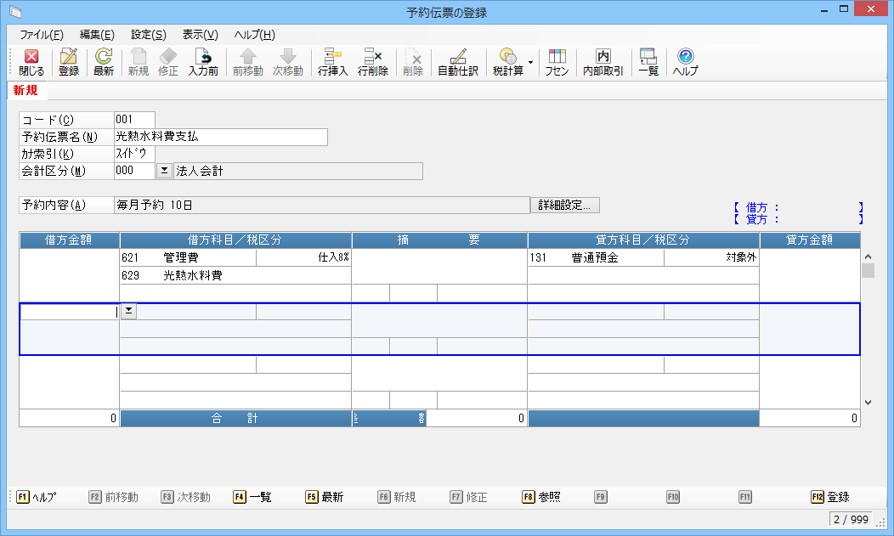 日常よく使用する仕訳や、毎月発生する仕訳を登録します。