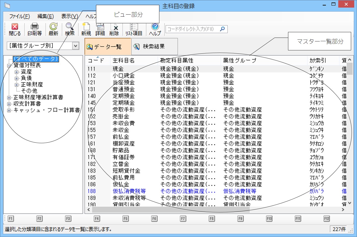 • ビューによる表示項目の絞り込み:「一覧表示画面」は画面左側のビュー部分と画面右側のマスター一覧部分に分かれています。ビューの選択により、表示するマスターを絞り込むことができます。