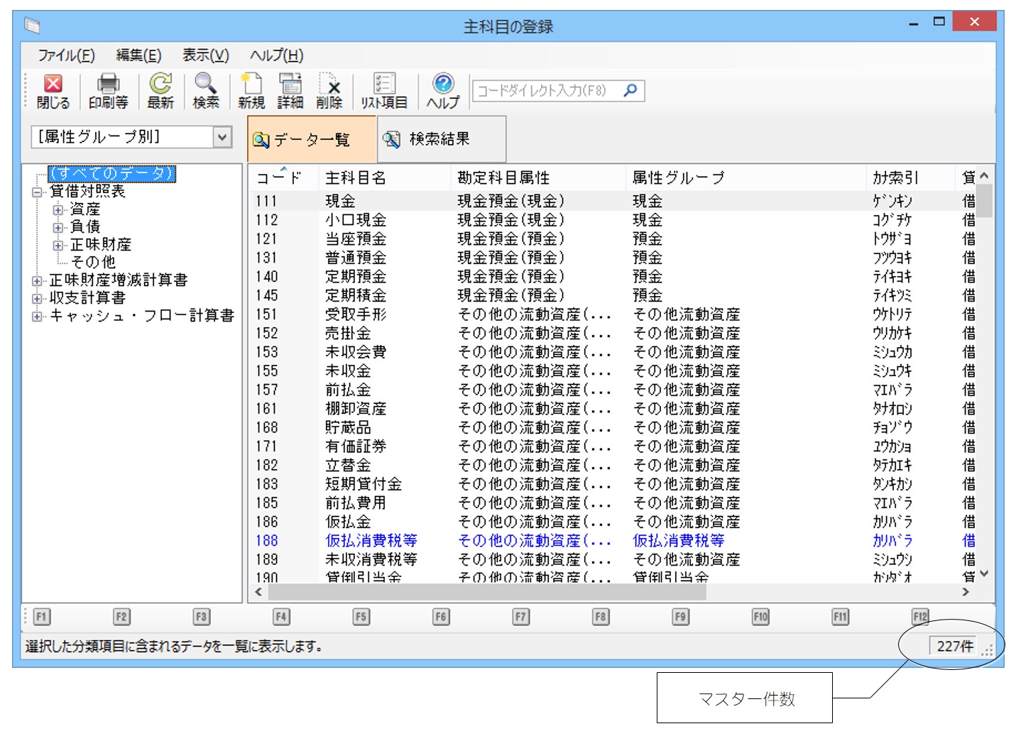 • 件数の確認:ステータスバーの右端に一覧表示されているマスターの件数を確認することができます。