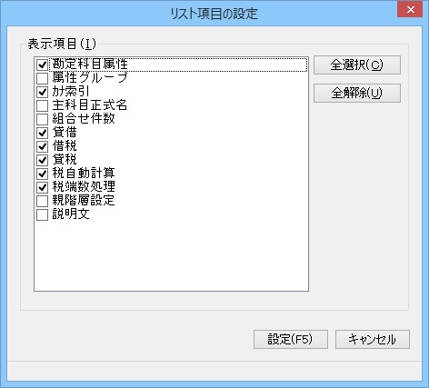 • リスト項目の設定:ツールバーの[リスト項目の設定]ボタンをクリックすると表示される「リスト項目の設定」画面で、マスター一覧部分に表示する項目を設定することができます。表示する項目にチェックマークを付けます。