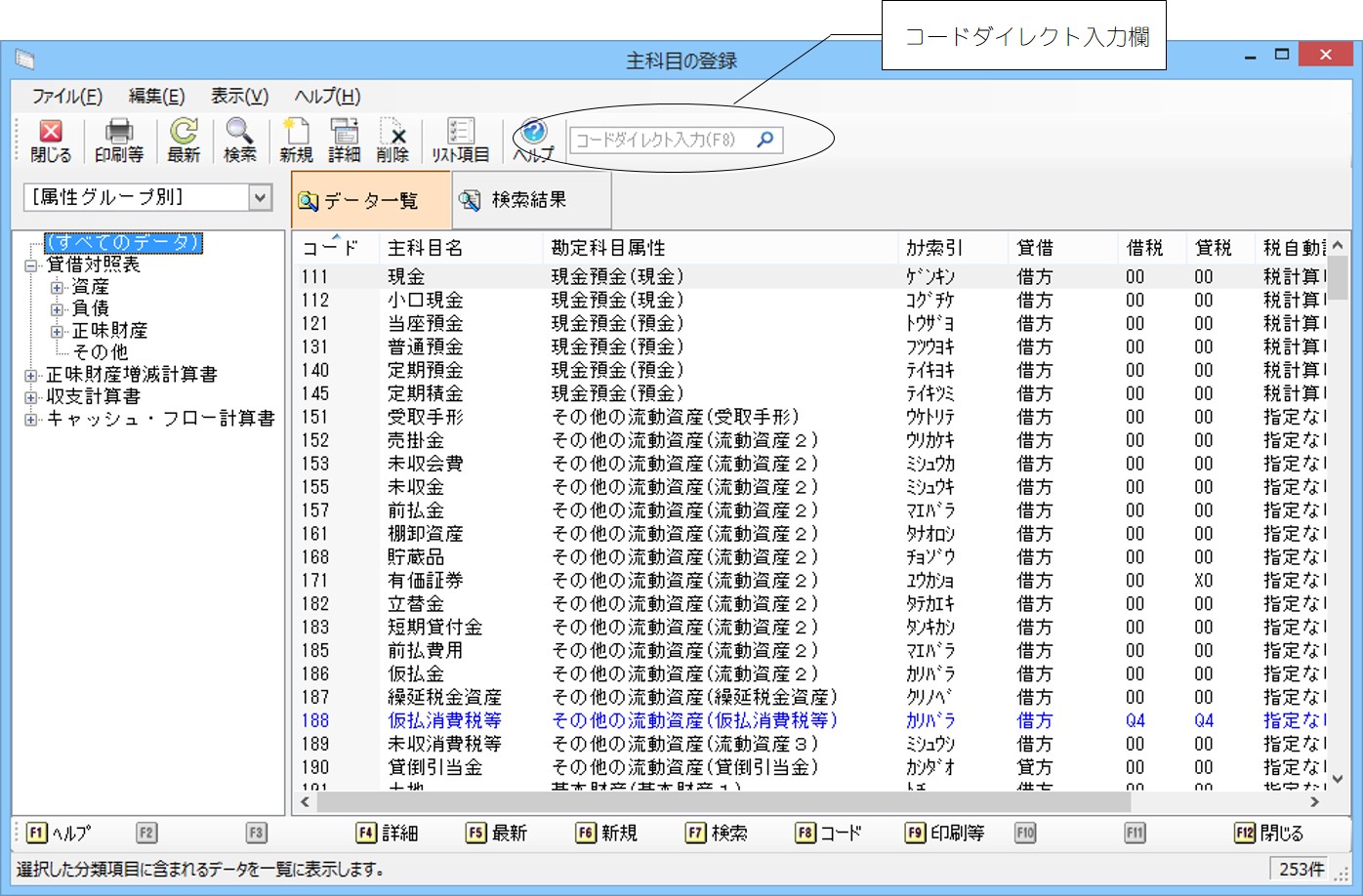 • コードのダイレクト入力(「主科目の登録」「中科目の登録」「小科目の登録」「補助科目の登録」「事業グループの登録」「摘要文の登録」「自動仕訳の登録」「予約伝票の登録」「配賦基準の登録」「配賦パターンの登録」で使用できます):「コードダイレクト入力」欄に任意のコードを入力して、[Enter]キーを押すか、右側のボタンをクリックすると、個別表示画面が直接表示されます。