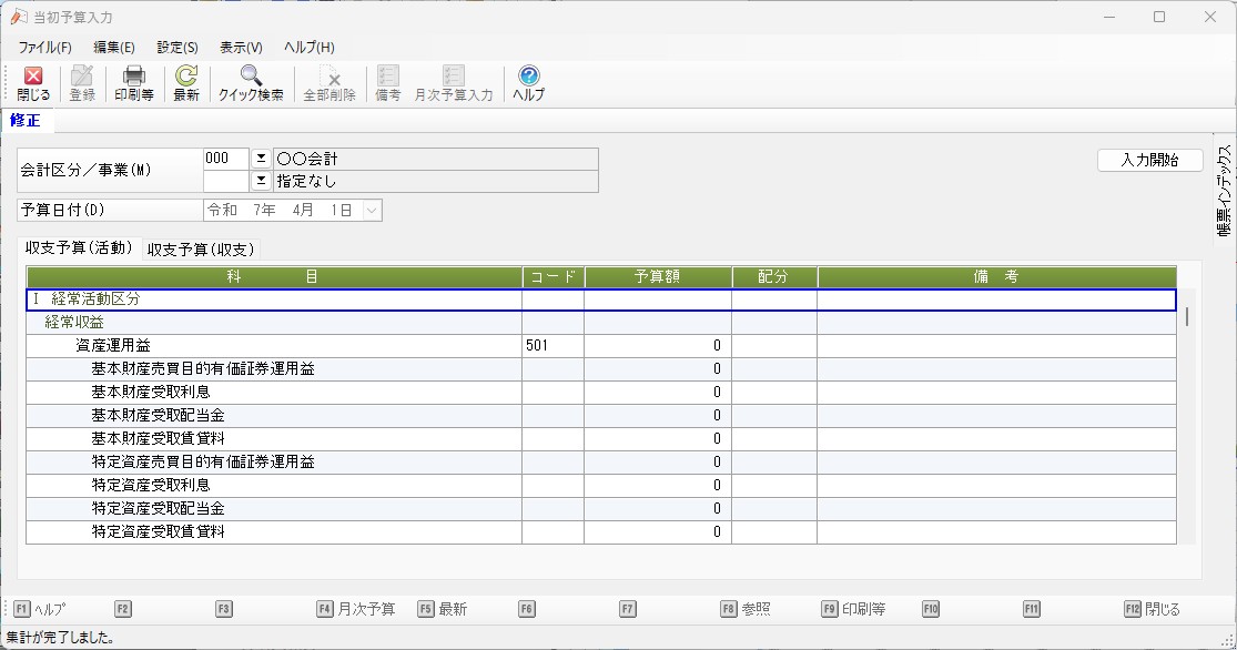 活動計算書科目(令和7年施行基準の場合のみ)、正味財産増減計算書科目(平成20年施行基準の場合のみ)と収支計算書科目 の当初予算を入力します。