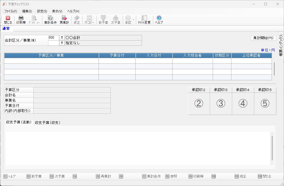 メニューの「予算入力」-「予算チェックリスト」を選択すると、次のような画面が表示されます。