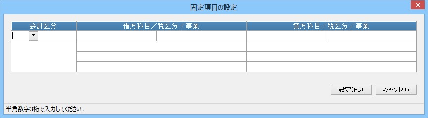 (2) 固定して入力したい会計区分、主科目と、主科目に対して固定したい補助科目、中科目、小科目、税区分、事業を借方、または貸方にコードで入力するか、ボタンをクリックして参照ウィンドウから選択します。