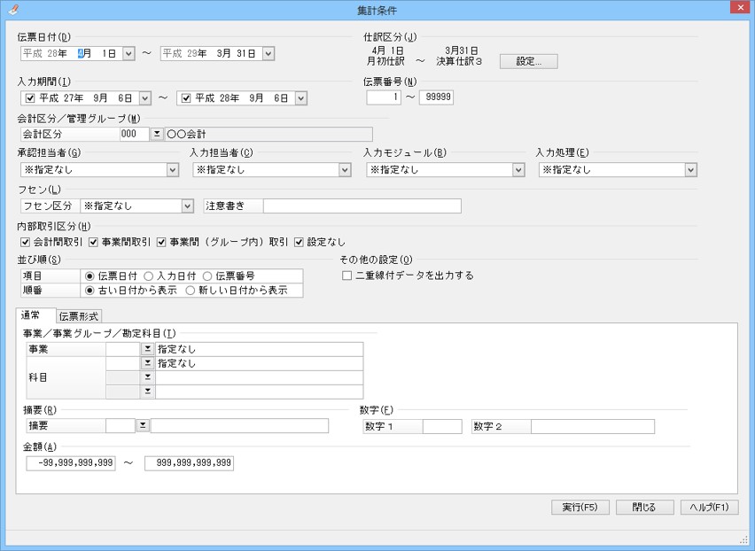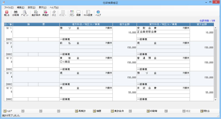 条件を指定して仕訳伝票を検索します。条件に該当する仕訳の明細が表示され、追加・修正・削除ができます。検索結果を印刷することもできます。