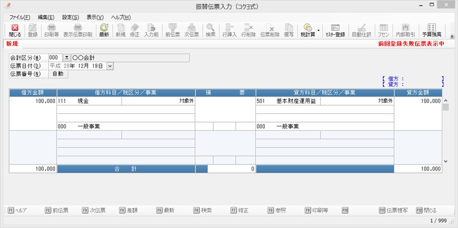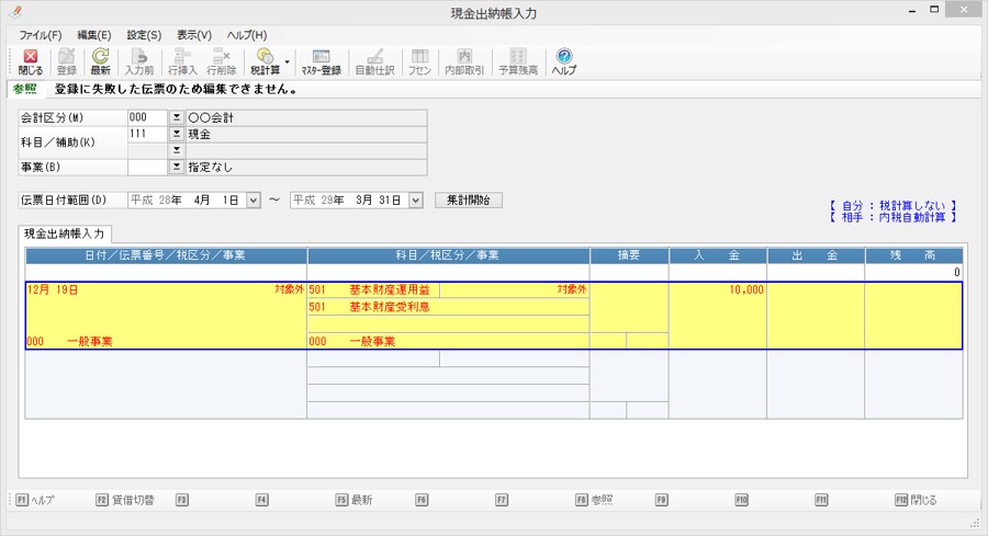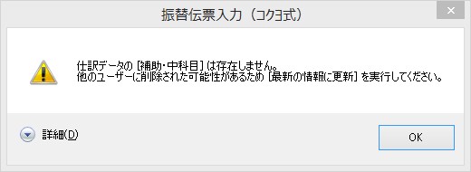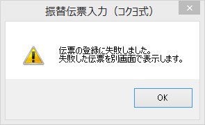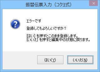 (1)  「振替伝票入力(コクヨ式)」「振替伝票入力(連想摘要)」「決算整理仕訳入力(コクヨ式)」「決算整理仕訳入力(連想摘要)」「キャッシュ・フロー調整仕訳入力」では、登録失敗、エラーの内容が表示され、別画面に登録しようとした内容が表示されます。