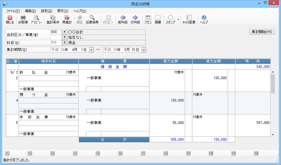 現金の出入を勘定科目別にまとめた帳簿を表示・印刷します。仕訳にスタンプを押すこともできます。